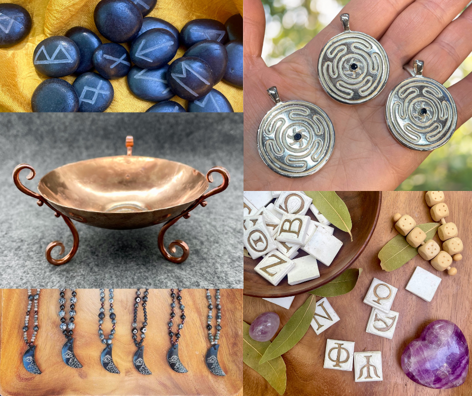 Handcrafted incenses and oils, ritual tools, books, bones and curios, tarot decks, candles.