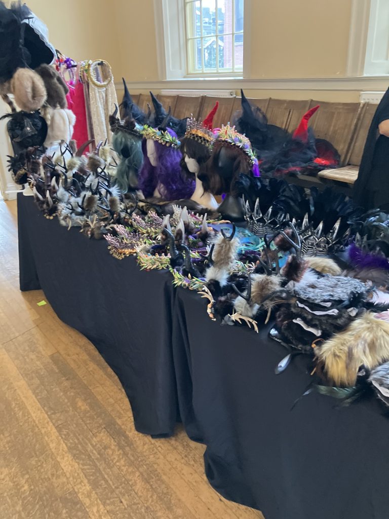 Variety of Hand made crowns, embellished hats, capes, shoulder pets.